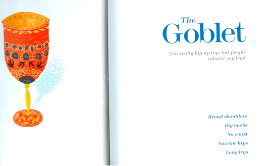 After the intro, the bulk of the book is 12 chapters, each one devoted to a body shape. (There are sections at the end for recycling/revamping your wardrobe plus a few UK-specific shopping guides.) Each chapter follows the same format. There is a page that introduces the shape with basic info, followed immediately by more exposition on the shape with a photo clearly labeling the features of the shape.