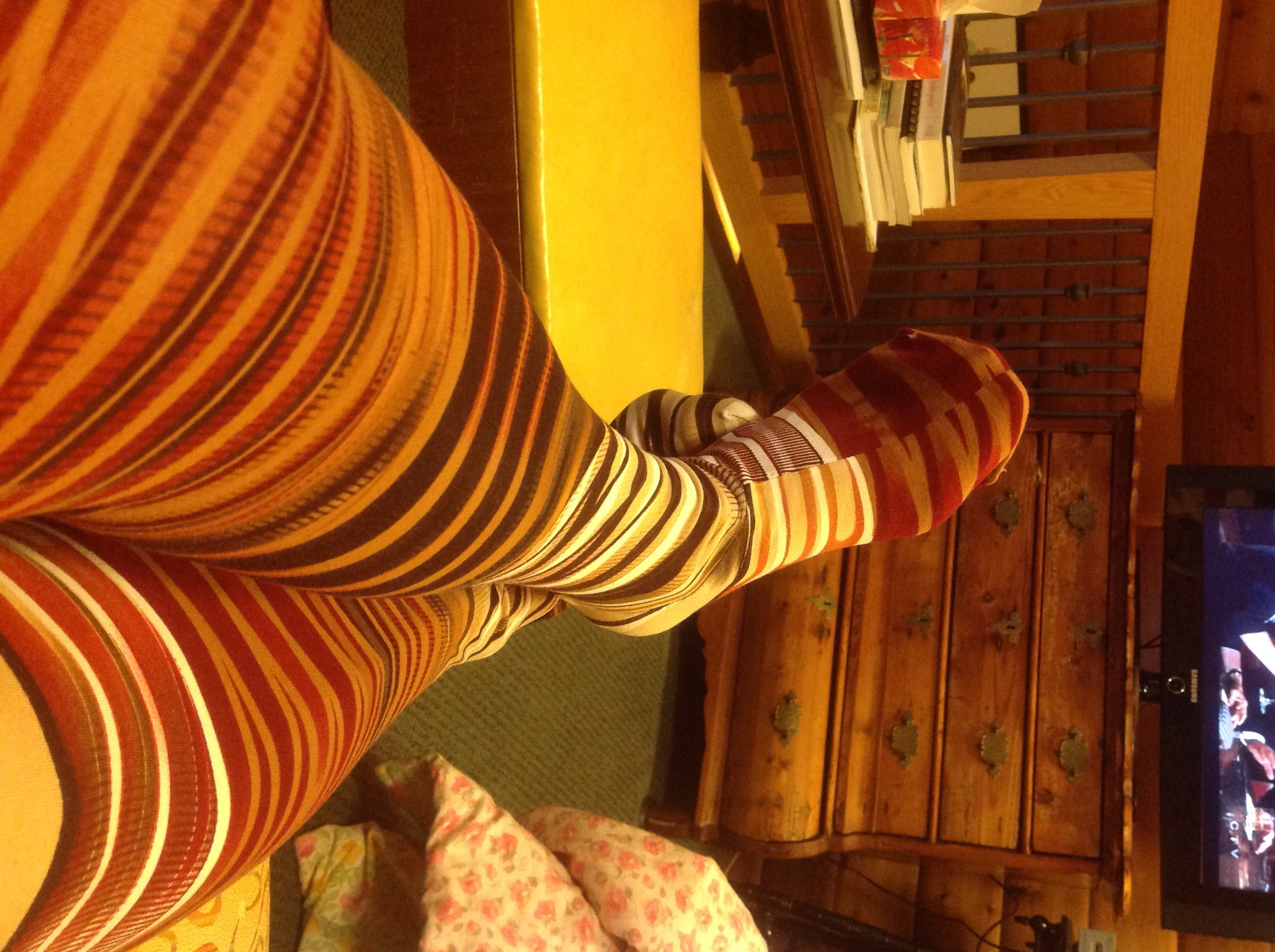 Cool tights! How fun is that. Mari’s instructions are that if you are in doubt, size down. I sized up for my first pair. Too big! I did my best to take them in and they are a lovely pair of tights. So I went back to trace the size XL. I was a 45″ hip last year! I did a 1inch addition at the center back waist line. I call this my “plumber butt” adjustment. I do this on almost every pair of pants I make. This pair is perfect. I can wear them all day and never never have to find a place to quietly adjust or wiggle them back up. I love that I can use 1 1/2″ elastic at the waist. I feel nice and secure with sturdy elastic. I love that the ankle does not bag. I love that all of my cool knits can be cool tights. I love that my tights are not in anyway sedate or ordinary. Complete strangers are stopping on the street to ask where I bought them.