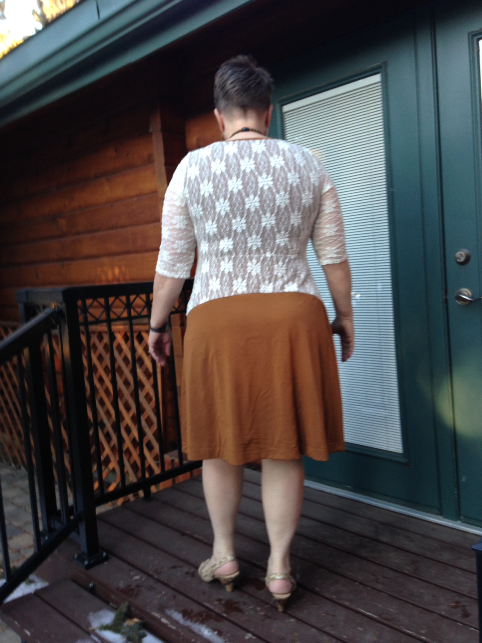 Fabric. I used a knit rayon/Lycra for the base of the dress. I love the cappuccino color of this fabric so it was the main contender for this dress. I also had a goldenrod yellow poly knit and a wine coloured poly knit out to audition with the stretch slightly yellow/cream lace I found in a bargain bin. The yellow lost out because it was poly. The wine coloured lost out because it was poly and too much of a “winter” color for an outdoor summer wedding! I think that was a good decision.
